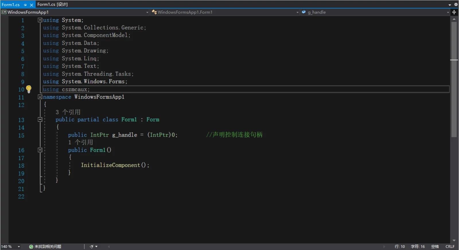 7.双击Form1.cs里面的Form1,出现代码编辑界面,在文件开头写入using cszmcaux,并声明控制器句柄g_handle。