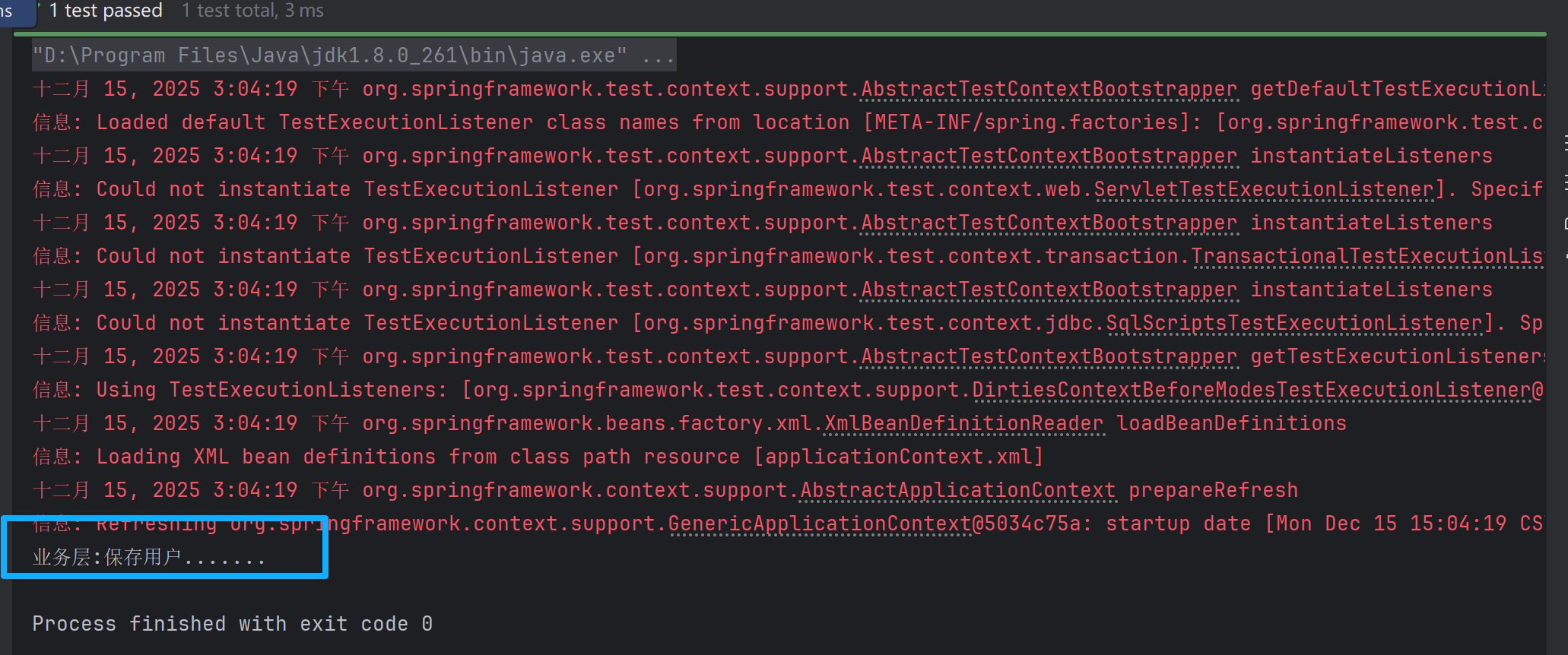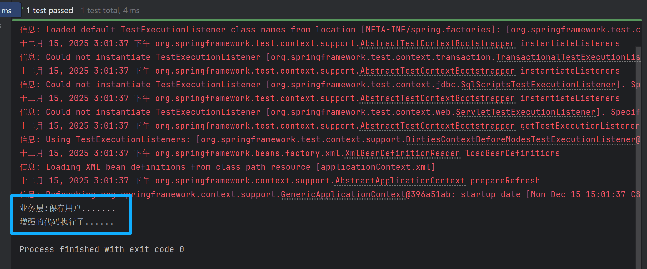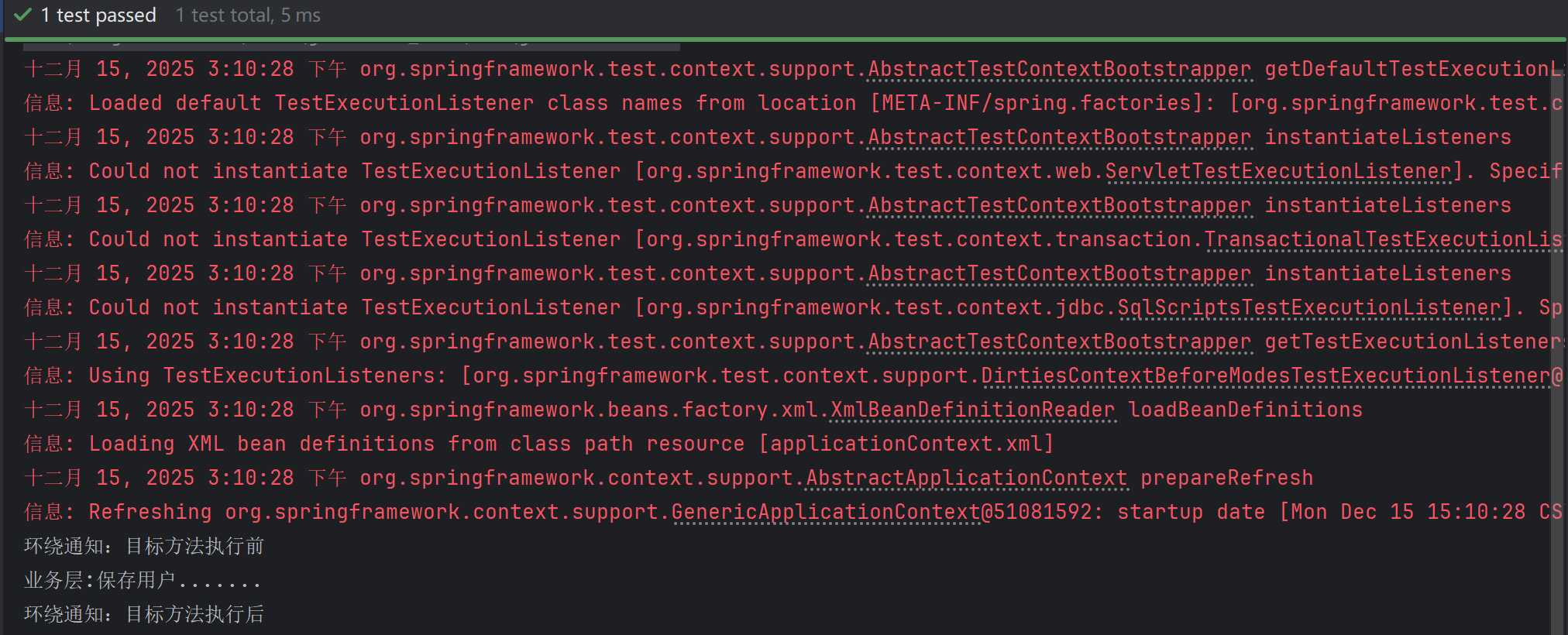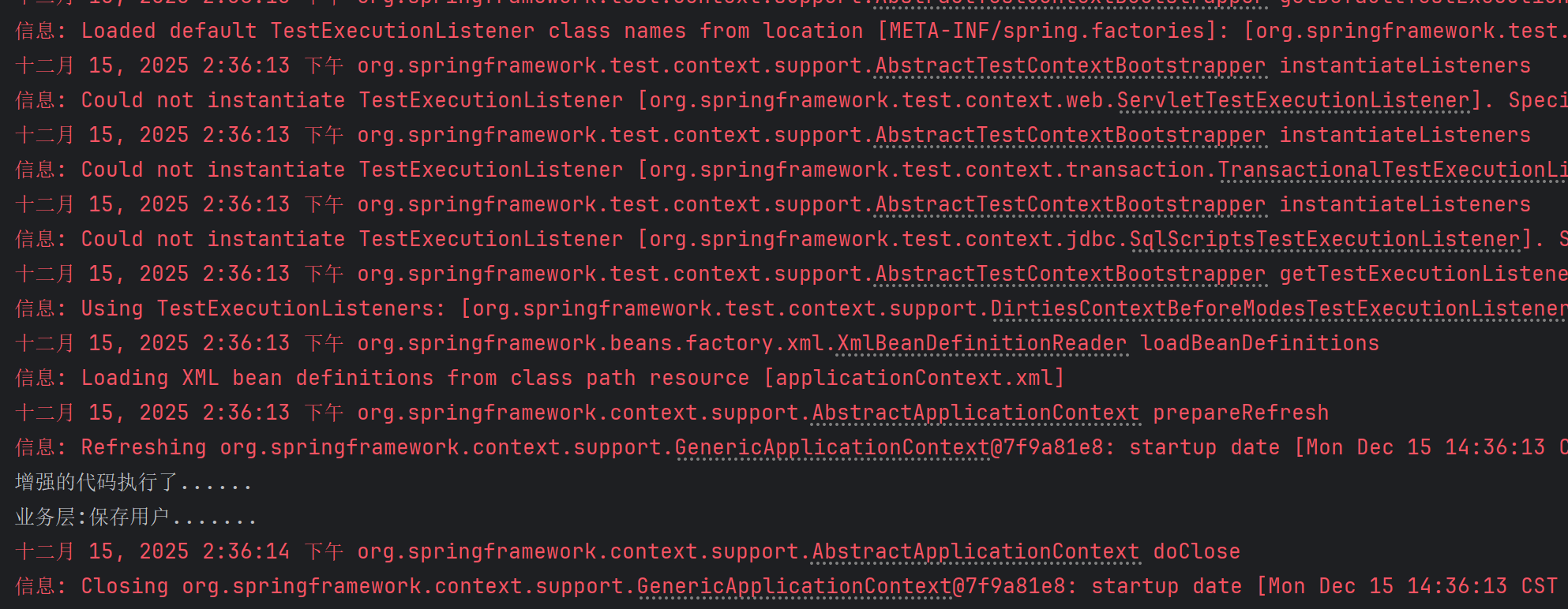 <aop:after-returning method="log" pointcut="execution(public void com.qcby.service.impl.UserServiceImpl.save())"/>