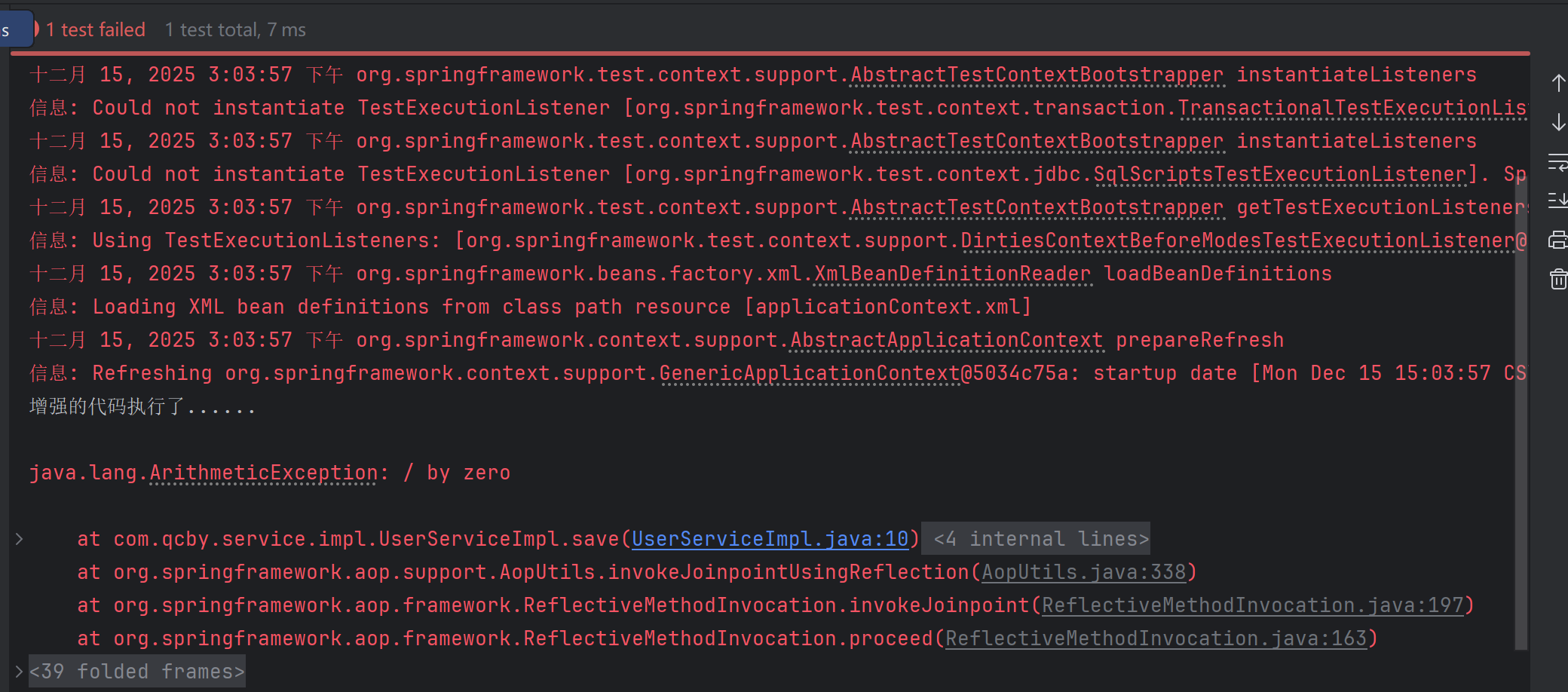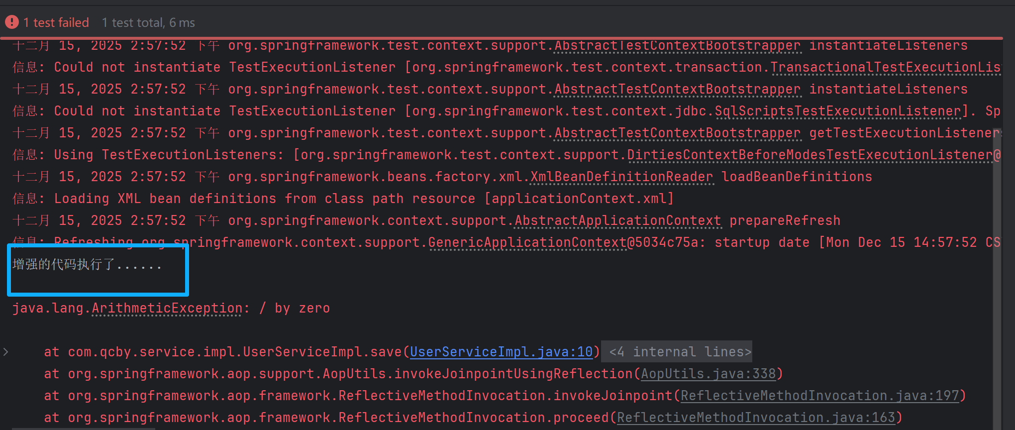 <aop:after-throwing method="log" pointcut="execution(public void com.qcby.service.impl.UserServiceImpl.save())"/>