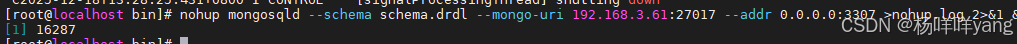 nohup mongosqld --schema schema.drdl --mongo-uri 192.168.3.61:27017 --addr 0.0.0.0:3307 >nohup.log 2>&1 &