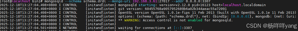 mongosqld --schema schema.drdl --mongo-uri mongo的服务器ip:mongo端口号 --addr 0.0.0.0:3307