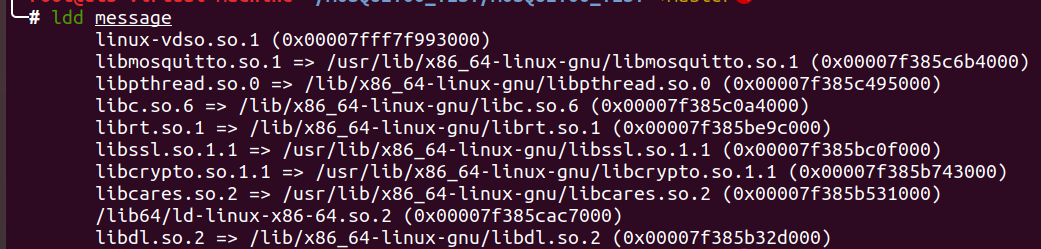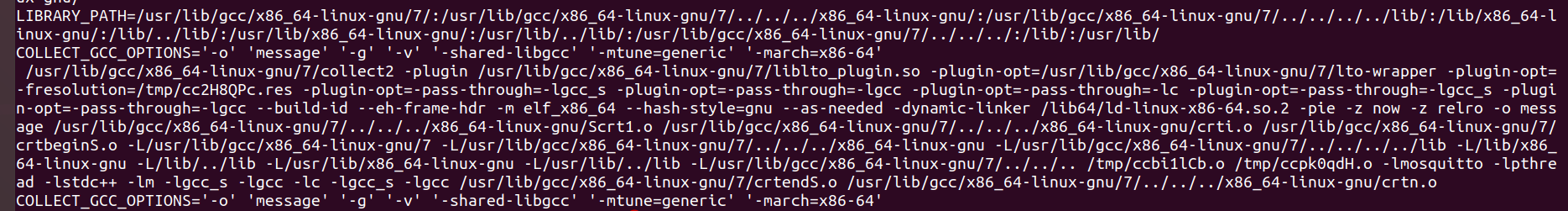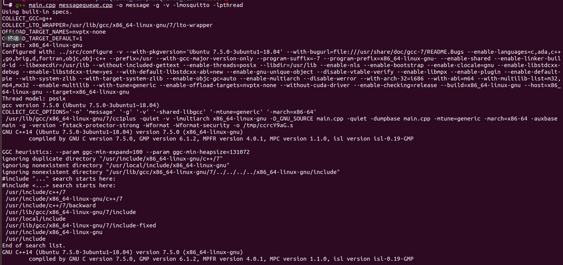 //使用g++编译器 将两个文件编译成message可执行文件,保存可调式信息,打印编译信息,链接库mosquitto和pthread