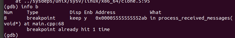 1 breakpoint keep y 0x00005555555562a0 in MessageQueue::push() at messagequeue.cpp:50
