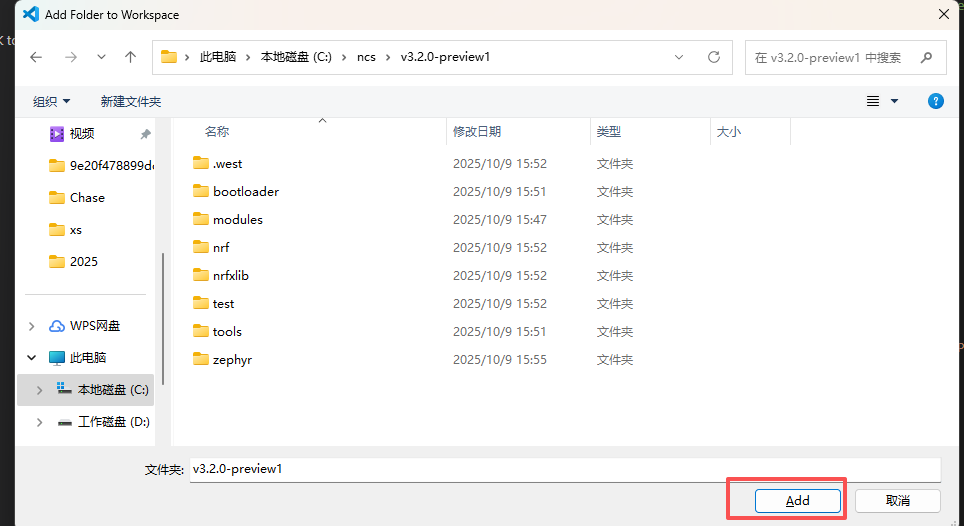 点击File 再点击Add Folder to workspace,将整个SDK添加到VS code的工作区,这样VS Code就可以识别到你的SDK,你现在用的SDK也是你添加到这个工作区的SDK版本