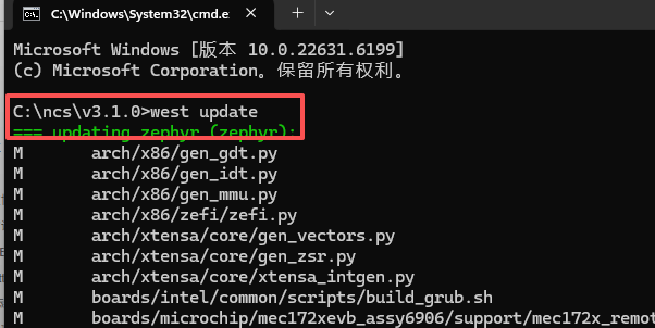 接着在解压目录下执行 west update,这样可以省略掉 安装SDK的步骤