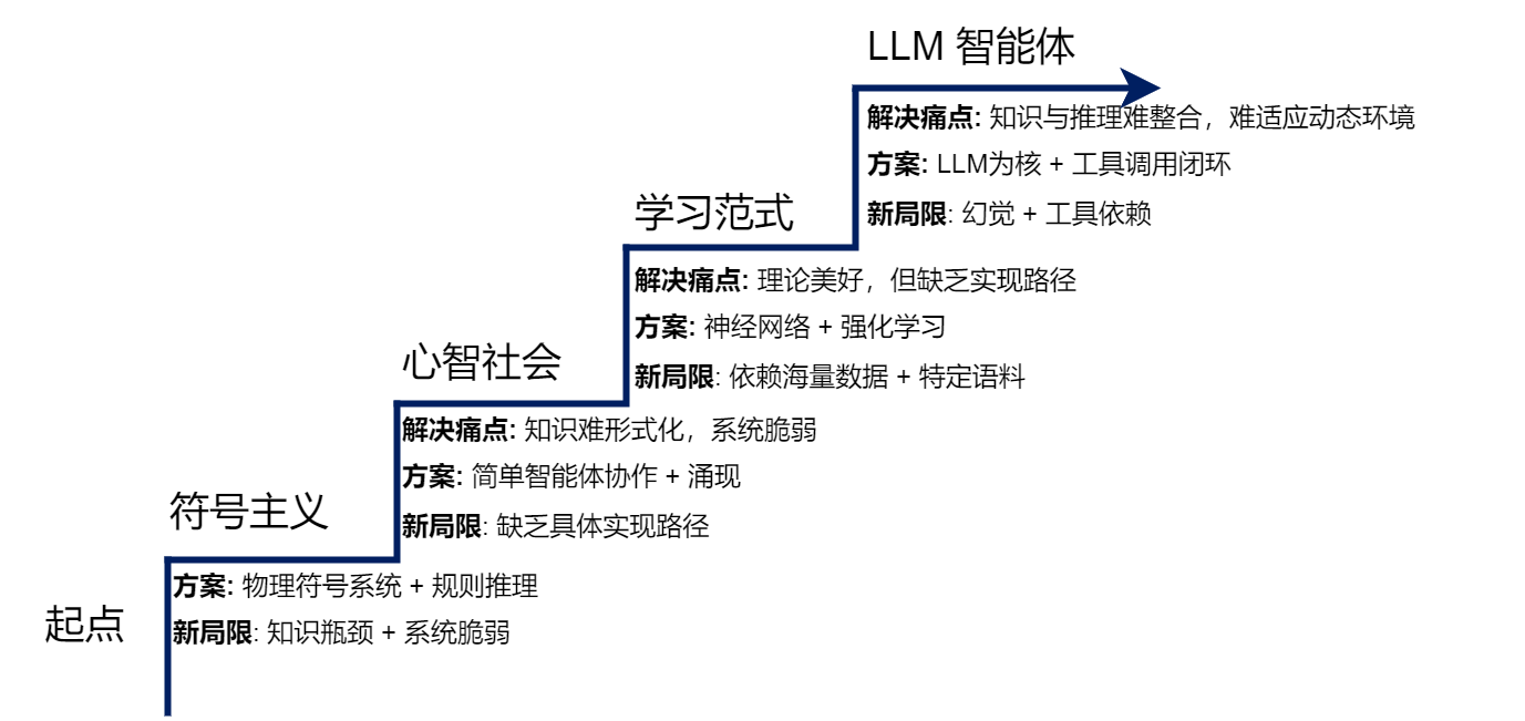 回顾智能体的发展史,我们不仅理解了现代智能体从何而来,更建立了一个关于智能体技术演进的宏观认知框架。从符号主义的探索与局限,到分布式智能思想的萌芽;从联结主义赋予智能体感知世界的能力,到强化学习使其学会在与环境的交互中进行最优决策;再到基于大规模数据预训练的大型语言模型为其提供了前所未有的世界知识和通用推理能力。