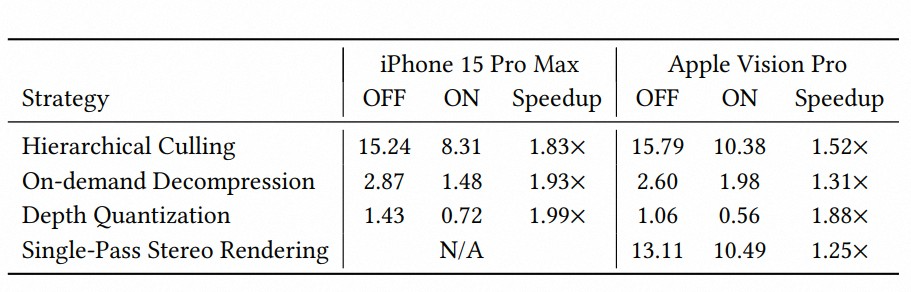在单个数字⼈配置下(约 53万⾼斯点),系统能够在 iPhone 15 Pro Max 上以 2K 分辨率、 120 FPS 稳定运⾏;多数字⼈场景下仍可保持实时表现,例如同时渲染三个数字⼈时,可达到 2K@30 FPS。在 Apple Vision Pro 上,系统同样实现了2K@90 FPS的实时渲染效果。