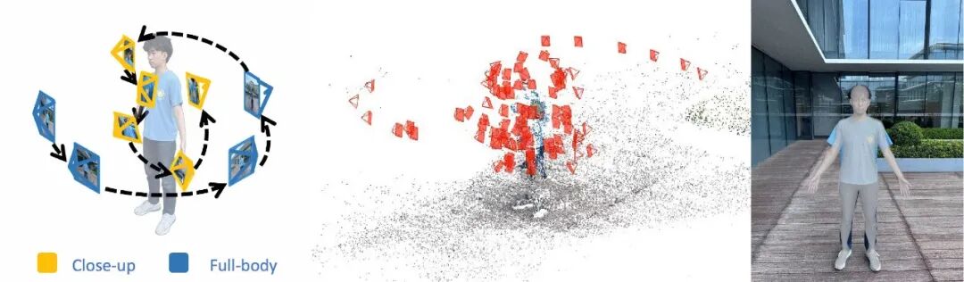 通过联合利⽤近景与全身帧,系统既获得了稳定的相机轨迹,也为后续⽹格重建与动态建模奠定了可靠的初始化条件。
