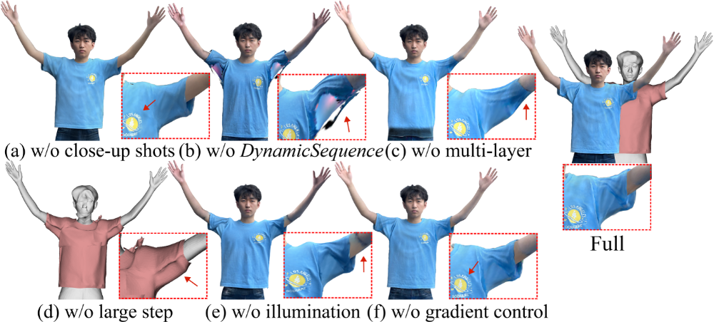 我们进⼀步进⾏了消融实验,以验证系统中各个组成模块对最终效果的影响。实验依次移除关键设计,包括显式服装⽹格、姿态相关的外表建模以及两阶段扫描协议,并在相同条件下⽐较⽣成结果。