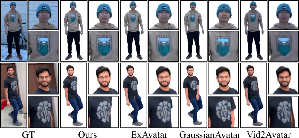 从定性结果可以观察到,在仅使⽤单⽬输⼊的条件下,现有⽅法在⾐物边界、⾼频纹理和细节区域(如褶皱、印花、层次结构等)往往表现较弱,容易出现模糊化或纹理漂移,⽽ HRM²Avatar 依托显式⾐物⽹格与⾼斯表示相结合的结构,能够保持更稳定的视觉细节和结构表达。尤其在跨视⻆与跨姿态驱动条件下,我们的⽅法在外观⼀致性上表现更稳定,未出现明显的拉伸或表⾯扭曲伪影。
