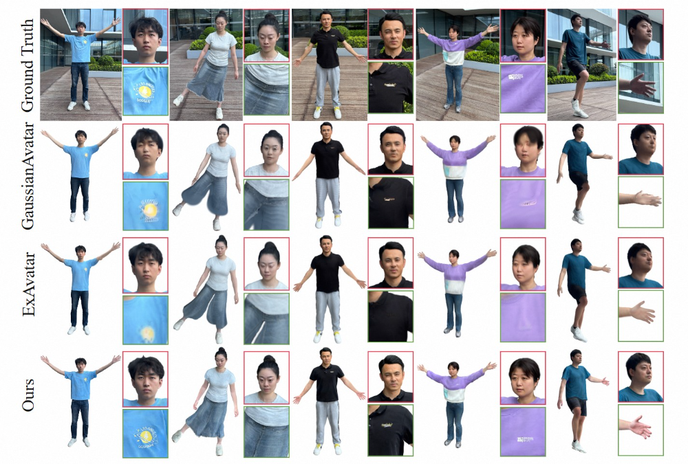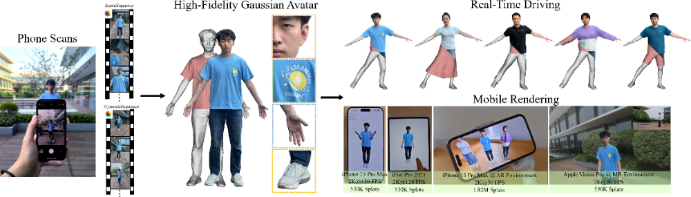 我们研发的基于⼿机单⽬视频⽣成⾼保真且可实时驱动的 3D 数字⼈的系统名叫 HRM²Avatar ,不同于依赖多相机阵列或深度硬件的⽅案,其在普通⼿机拍摄条件下重建⼈物形体、服饰结构以及细节级外观表达,并⽀持在移动设备上实时渲染与动画驱动。系统采⽤显式服装⽹格与⾼斯表示相结合的建模⽅式:⽹格提供稳定的结构与可控性,⾼斯则⽤于呈现褶皱、材质和光照变化等细节,使虚拟⼈在不同姿态下依旧保持连续、⾃然的外观表 现。此外,基于轻量化推理设计与移动端渲染优化策略,⽣成的数字⼈可在⼿机、头显等移动设备上流畅运⾏。实验结果表明,我们的系统在视觉真实感、跨姿态⼀致性以及移动端实时渲染之间取得了良好平衡。