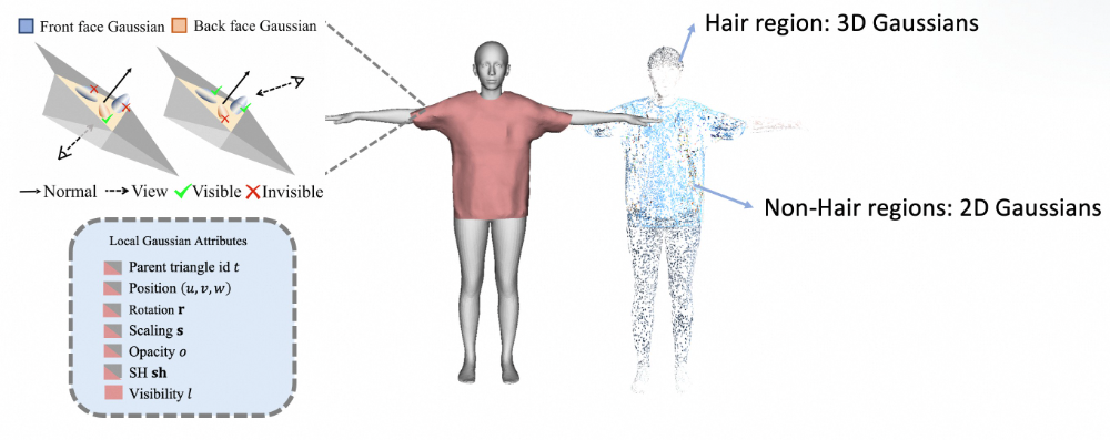在穿⾐⼈体⽹格上,我们为每个三⻆形附着⾼斯点,构建混合数字⼈表征: