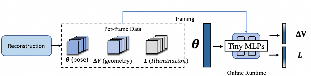 在重建阶段,我们已经获得了逐帧的姿态、⼏何偏移和光照参数。基于这些结果,我们采⽤蒸馏⽅式训练⼀个轻量级的预测⽹络,使其学习姿态到⼏何形变与光照变化的映射关系。训练完成后,系统不再依赖逐帧重建数据,仅输⼊姿态即可实时预测对应的⼏何偏移与光照参数,从⽽⽀持移动端的实时驱动与渲染。