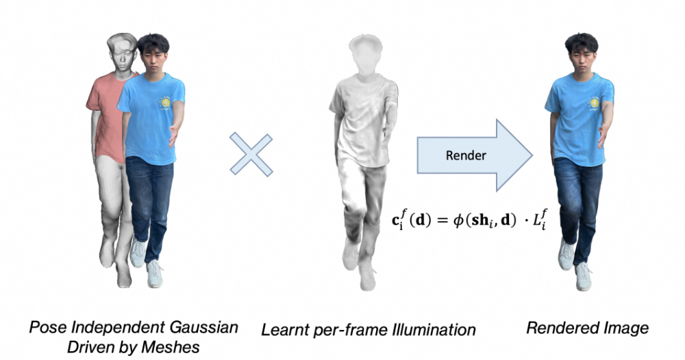 ⼈体姿态变化会导致光照分布发⽣变化,例如阴影位置偏移、局部亮度变化等。为建模这种随动作变化的光照效应,我们引⼊⼀个轻量化的单通道姿态相关光照项,⽤于描述运动驱动的光照变化特征。