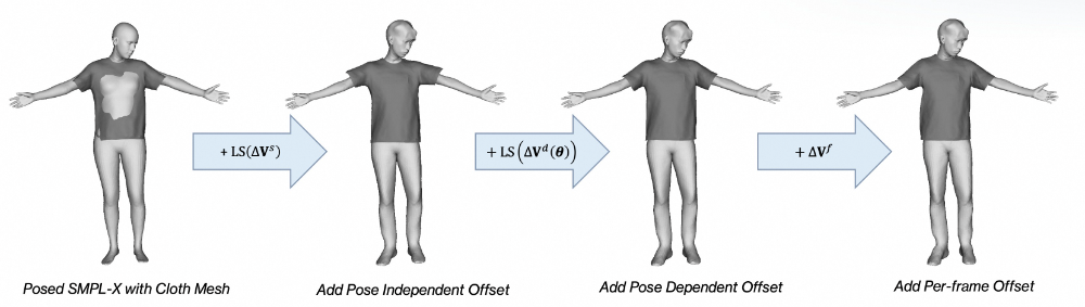在获得相机与姿态初始化后,系统从静态序列中构建可动画的穿⾐⼈体⽹格。这⼀过程包括以下步骤: