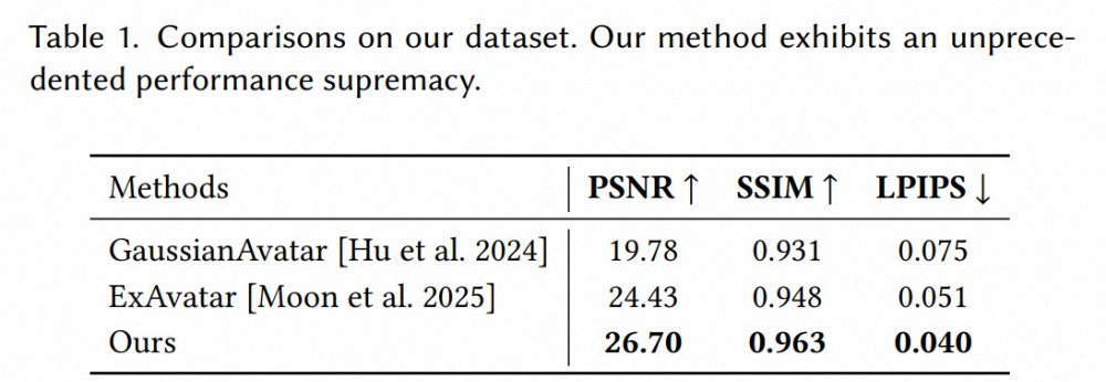 整体来看,性能测试表明 HRM²Avatar 能够在移动设备上维持稳定的实时运⾏表现,同时兼顾⾼分辨率渲染质量与系统响应延迟,为实际交互场景部署提供可⾏性基础。