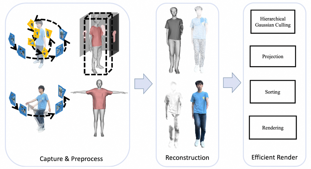 基于上述挑战,我们提出了针对移动端的⾼保真实时3D数字⼈重建与渲染系统 HRM²Avatar,核⼼采⽤两阶段采集⽅式、显式⾐物⽹格表示与基于⾼斯的动态细节建模,并结合⾯向移动端设备的⾼效渲染优化策略,在保证外观质量与动态表现的同时,实现从扫描到实时驱动的完整重建流程。