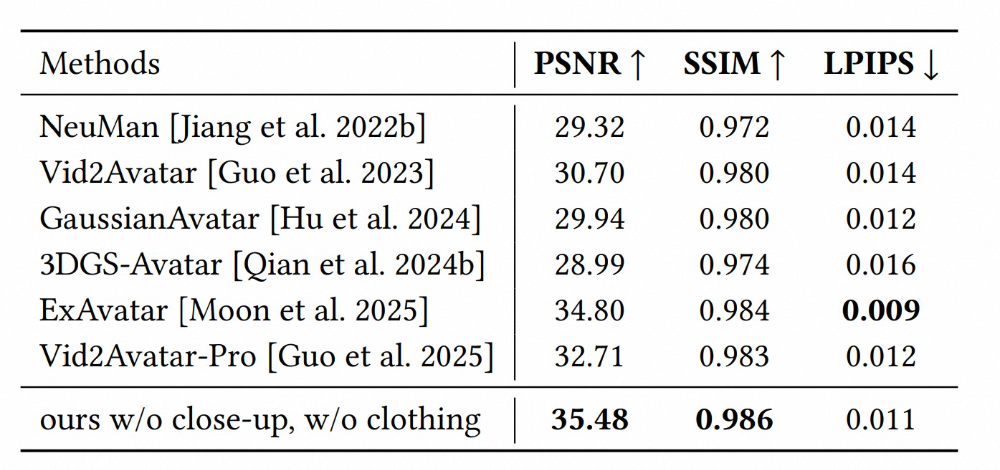 在客观指标上,我们使⽤ PSNR、SSIM 和 LPIPS 对⽅法进⾏量化⽐较。结果表明, HRM²Avatar 在所有指标上均取得更优表现:在 LPIPS 上分数更低,⽽在 PSNR 和 SSIM上更⾼,显示出更清晰的纹理保留和更稳定的结构⼀致性。值得注意的是,即使在新的姿态条件下,这⼀优势仍然保持,说明所建模的姿态相关的外表建模能够有效避免纹理漂移并提升跨姿态⼀致性。