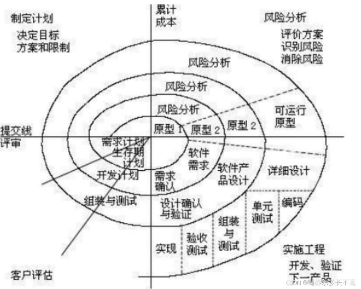 一般在软件开发初期阶段需求不是很明确时,采用渐进式的开发模式。螺旋模型是渐进式开发模型的代表之一。
