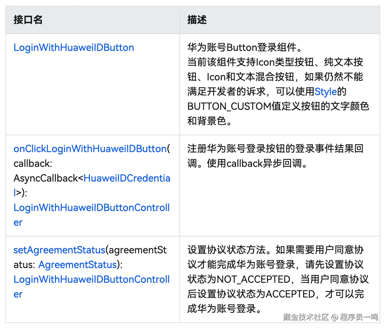 自定义按钮,和以上的代码没什么大的区别,唯独是需要自己触发登录请求逻辑,登录成功之后,就可以拿到华为账号的相关信息,接着就可以上传到服务端或者存储到本地,做一些其他的操作,有一点需要注意,有可能avatarUri头像返回为undefined,你可以做判断后,等于一个默认的头像。