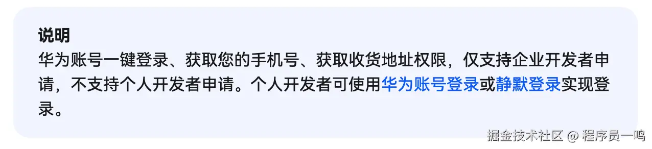 可能有的同学会有疑问,为什么是华为账号登录,而不是华为账号一键登录,这里需要解释的是,目前华为账号一键登录不支持个人开发者,所以,没办法,只能用官方推荐的华为账号或者静默登录。