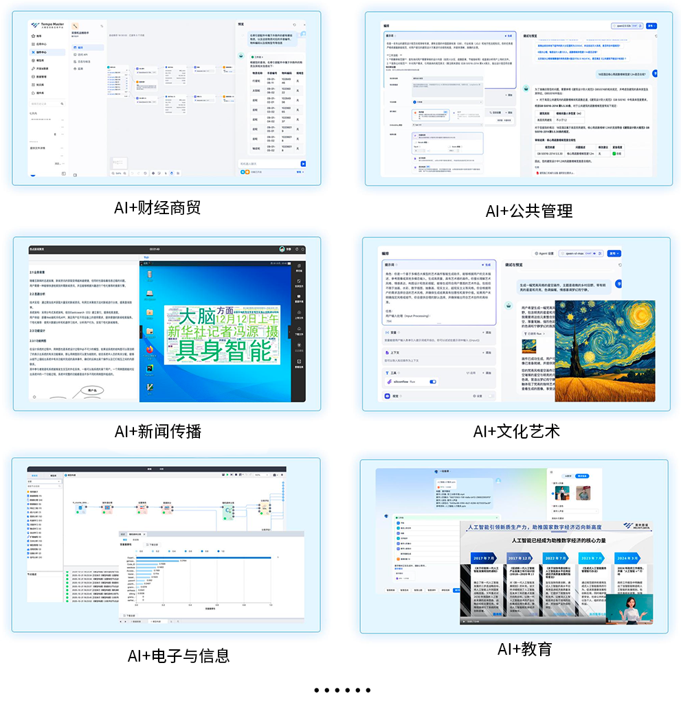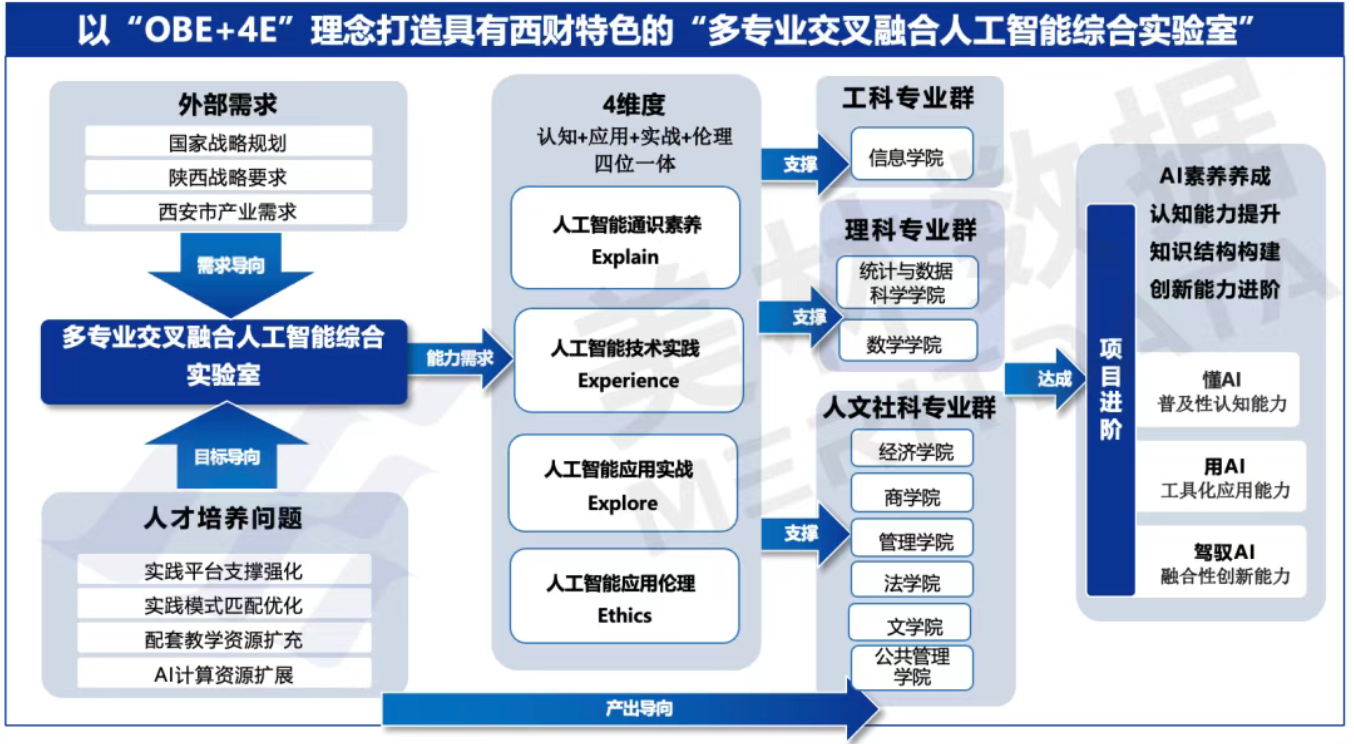 本次与美林数据联合建设的"多专业交叉融合人工智能综合实验室",精准契合学校发展诉求。项目以 "多学科协同、实践驱动、智能化支撑" 为核心,立足西安财经大学经、管、法、文、理、工多学科协调发展的办学特色,为全校学生量身打造了 "AI素养提升→AI技术体验→AI跨学科应用→AI伦理思辨" 的全链条人工智能通识教育生态。