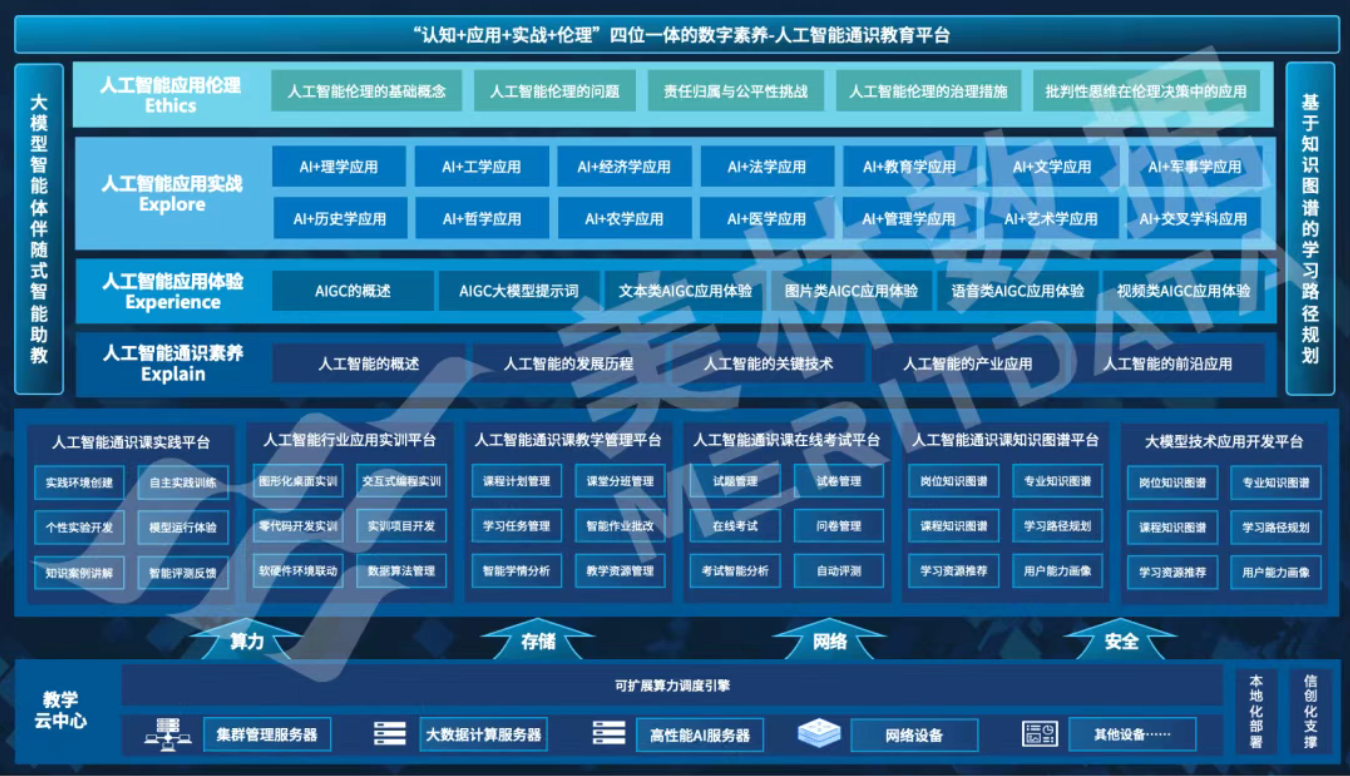 项目整体基于美林数据"4E"人工智能通识教育体系,打造了一套 "阶梯递进、学科融合、动态演化" 的课程资源体系,旨在引导学生完成从AI认知者到实践者,再到深思者的完整素养跃迁。