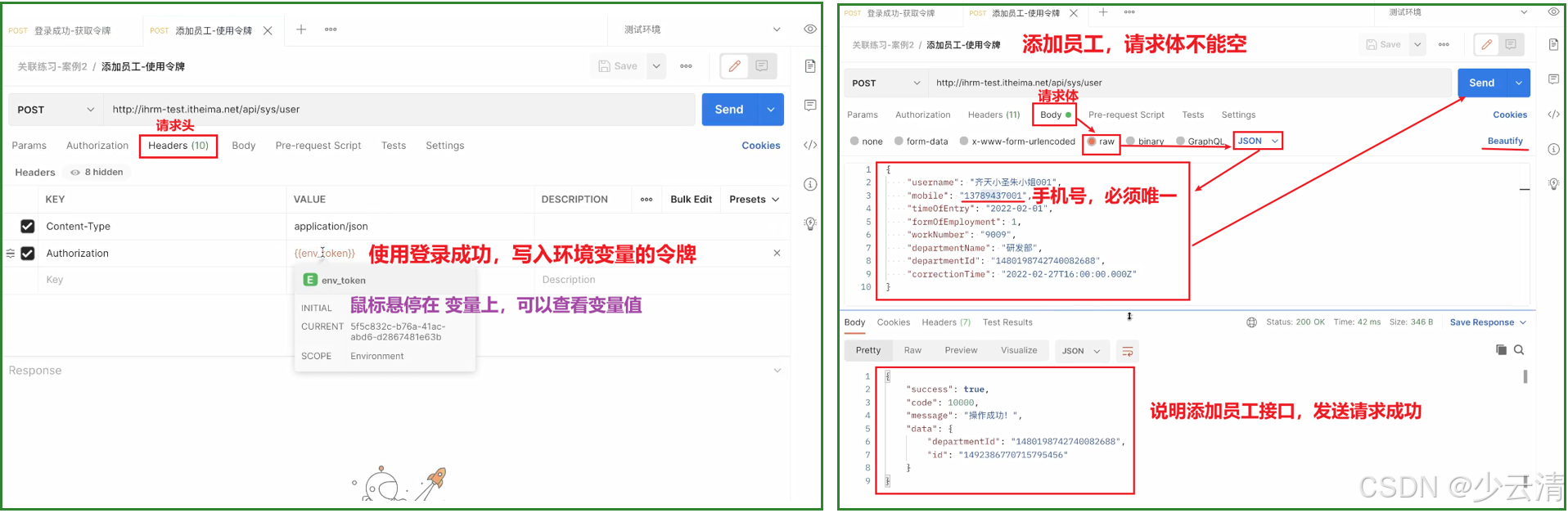 - 登录 http请求,返回的 令牌。 被 添加员工 请求 依赖(请求头中使用)。 可以使用 postman的关联技术来使用。