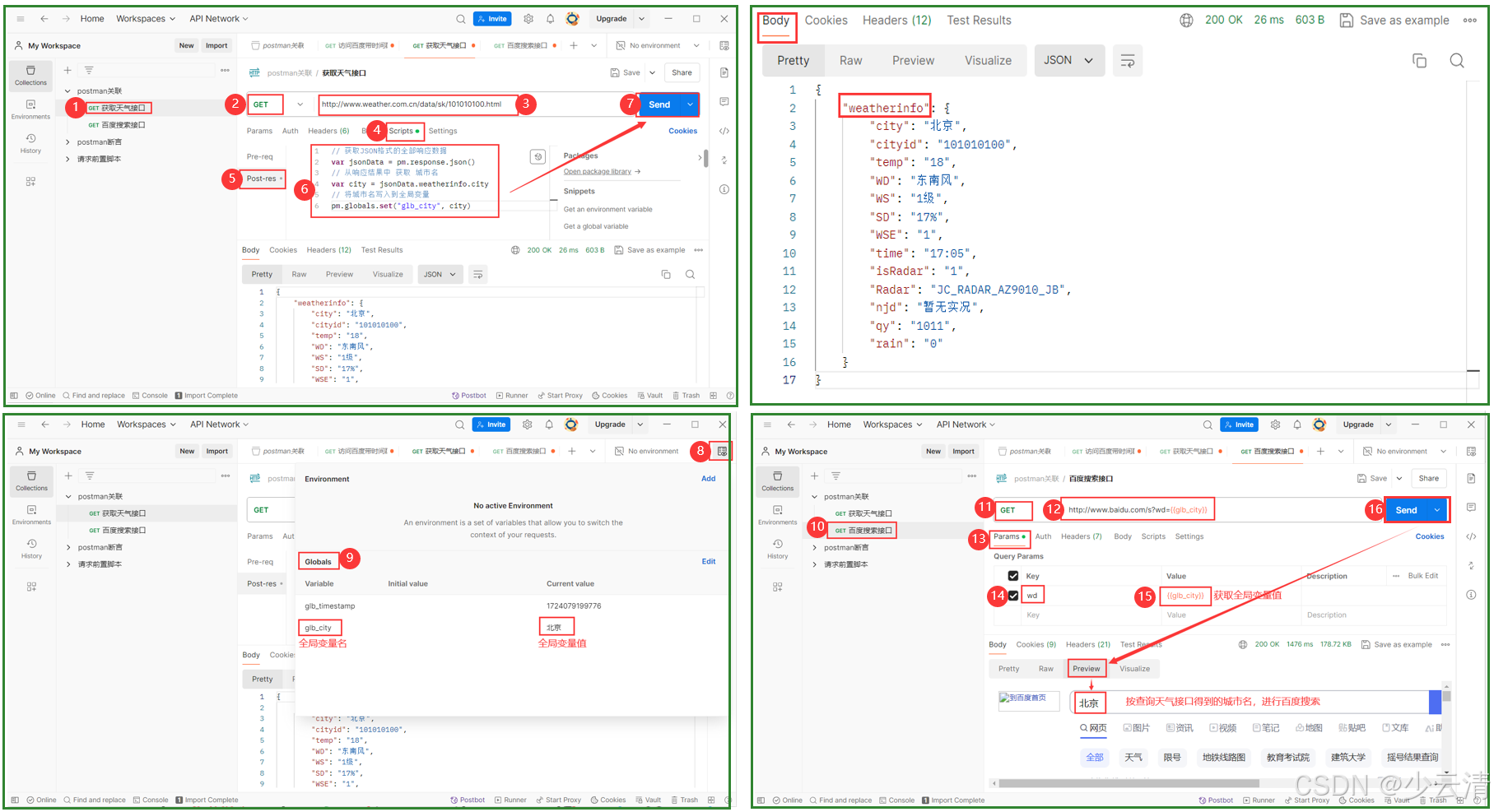 2、在查询天气请求 Tests 中,编写代码 获取 城市名,写入全局变量