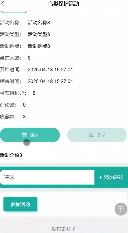 该系统的研究具有显著的社会价值与学术意义。从社会层面看,系统通过AI图像识别技术实现快速鸟类识别,结合结构化科普知识库,帮助用户系统化学习鸟类知识,提升公众生态保护意识;科研人员可利用用户上传的观鸟数据(去隐私化处理)进行统计分析,补充传统科研样本,降低数据收集成本;平台提供的社区交流功能,促进用户分享观鸟经验,形成良性互动生态。从学术层面看,系统采用前后端分离架构,前端基于微信小程序实现轻量化交互,后端以SpringBoot为核心构建微服务模块,探索了微服务与轻量级前端的协同设计模式,为类似系统的开发提供了技术参考;同时,系统通过集成第三方鸟类识别API、Redis缓存、分布式事务(Seata)等技术,解决了高并发、数据一致性等实际工程问题,推动了技术落地应用。
