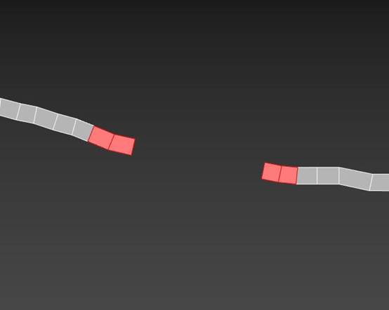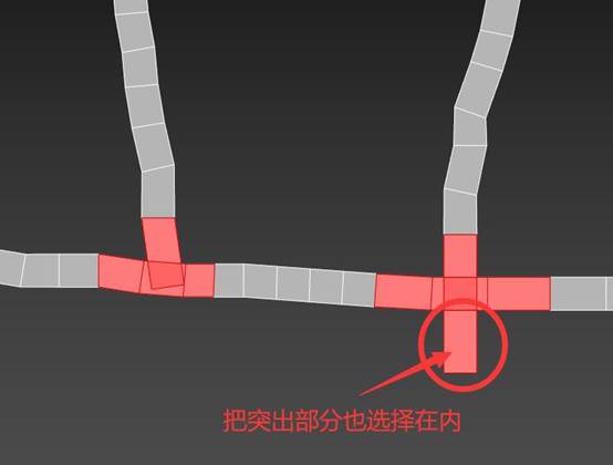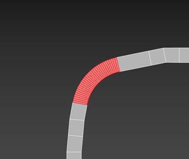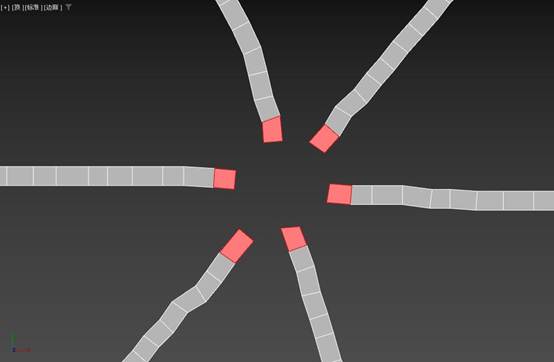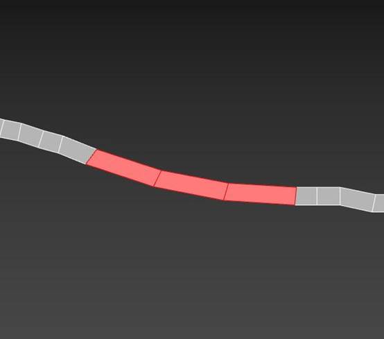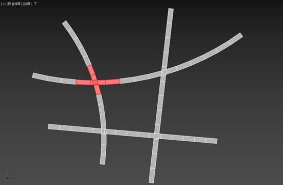 1.选择可编辑多边形道路对象(如果不是可编辑多边形,右键将其转化为可编辑多边形),切换到"多边形(面)"子物体,选择要参与生成交差路口的多边形(面)。如图: