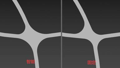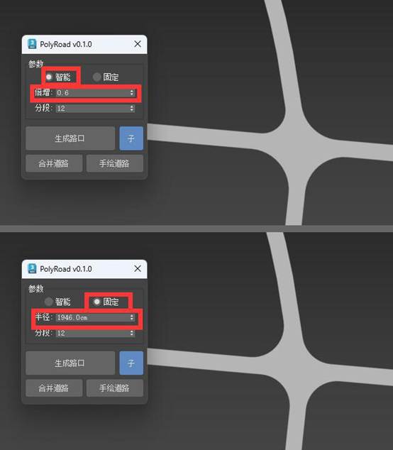 4.修改交叉路口切角大小**(需要注意的是,要先生成路口,再调节路口切角大小)**。智能型路口大小调节使用"倍增"能数;固定型路口大小使用"半径"参数。如图: