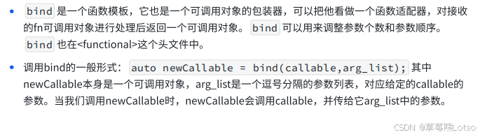 std::bind是函数模板,可调整可调用对象的参数个数、顺序,绑定固定参数,返回一个新的可调用对象。