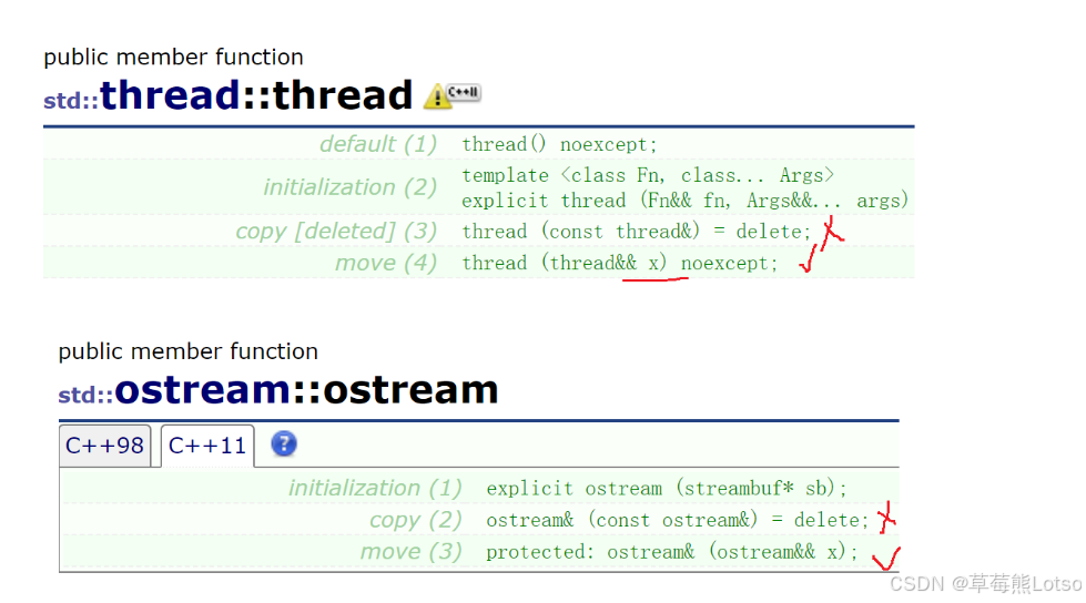 - 手动实现拷贝构造 / 赋值后,默认移动构造 / 赋值不再生成,需手动添加或用