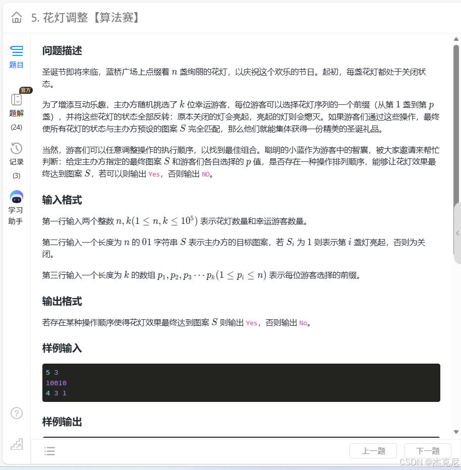 在算法竞赛中,"操作叠加的状态判定"类问题是高频考点之一 ------ 这类问题的核心是 "操作的顺序不影响最终状态,仅与操作次数的奇偶性有关"。本文以 "花灯调整" 问题为例,从问题拆解、核心规律、后缀和原理、代码实现等维度,全面讲解如何用后缀和高效解决这类问题,同时深入剖析代码的每一个细节,帮助你掌握这类问题的通用解法。