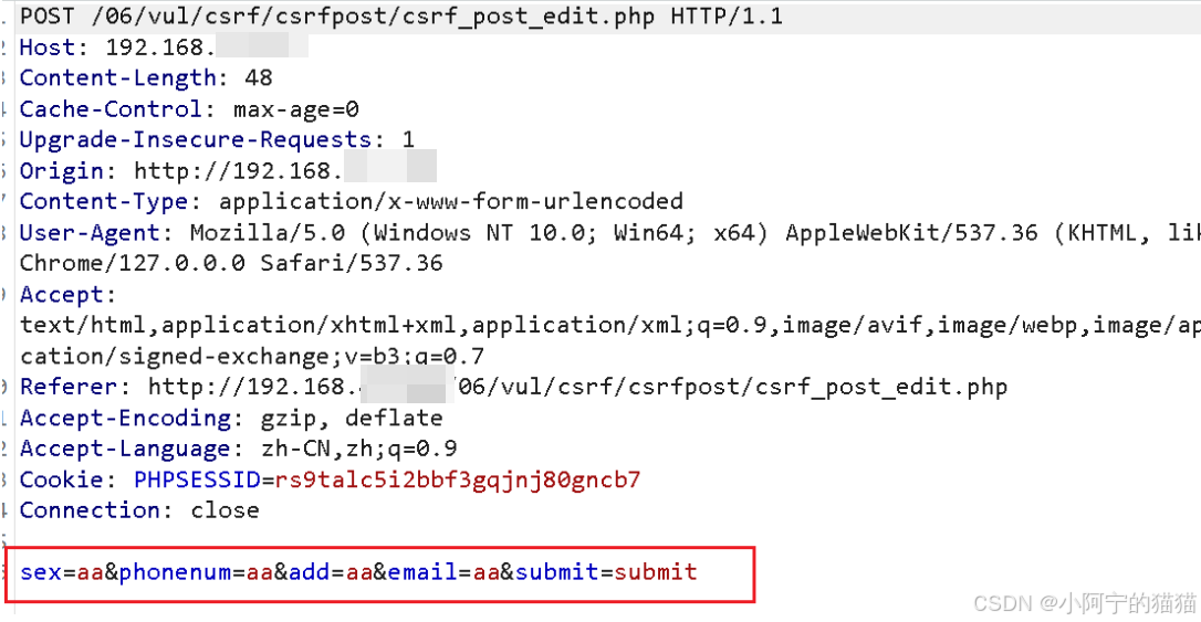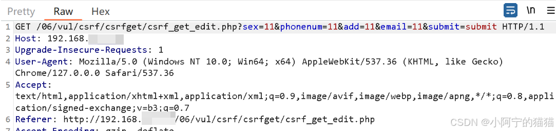 http://192.168.xxx..xxx/06/vul/csrf/csrfget/csrf_get_edit.php?sex=11&phonenum=11&add=11&email=11&submit=submit
