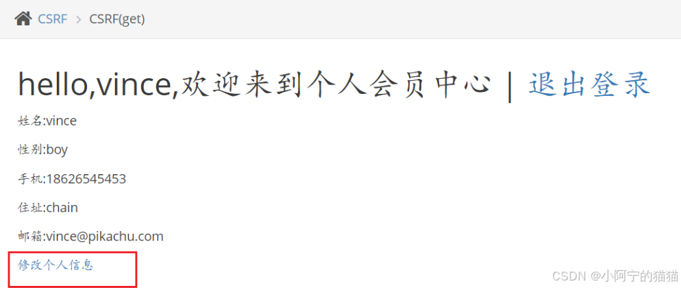 打开 pichachu 靶场来到 csrf漏洞,输入用户登录后发现修改密码处没有任何验证,存在 csrf 攻击,通过 csrf 漏洞攻击修改资料。
