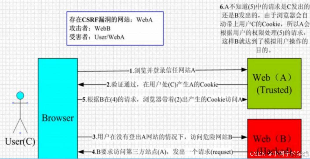 受害者登录到受信任的网站A(进行了身份验证并获取了会话 cookie),攻击者引导受害者访问恶意网站B(该网站是攻击者创建的一个恶意网站或在受害者访问的第三方网站上植入了恶意代码),然后恶意网站B发送请求到受信任的网站A(这是一个自动提交的请求,是去登录网站A的,可以是post,里面会有一些操作请求),因为用户已经登录了网站A,浏览器会自动附上相关的会话 cookie。网站A接收请求之后,认为是合法用户发出的,网站A在未验证请求来源的情况下执行了请求中的操作(请求中的操作不需要验证)。