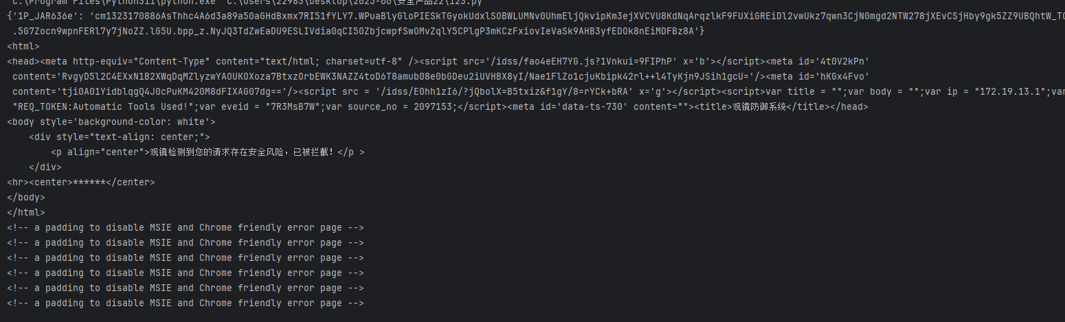 立马就知道了,这是一个安全产品。然后在网上搜了下爬虫攻略,发现搜不到。然后我真的菜,花了一天时间才搞出来。这应该是一个比较新型的安全产品,网上找不到攻略。然后我就写下这篇文章,记录逆向过程。我不会是全网首发的。