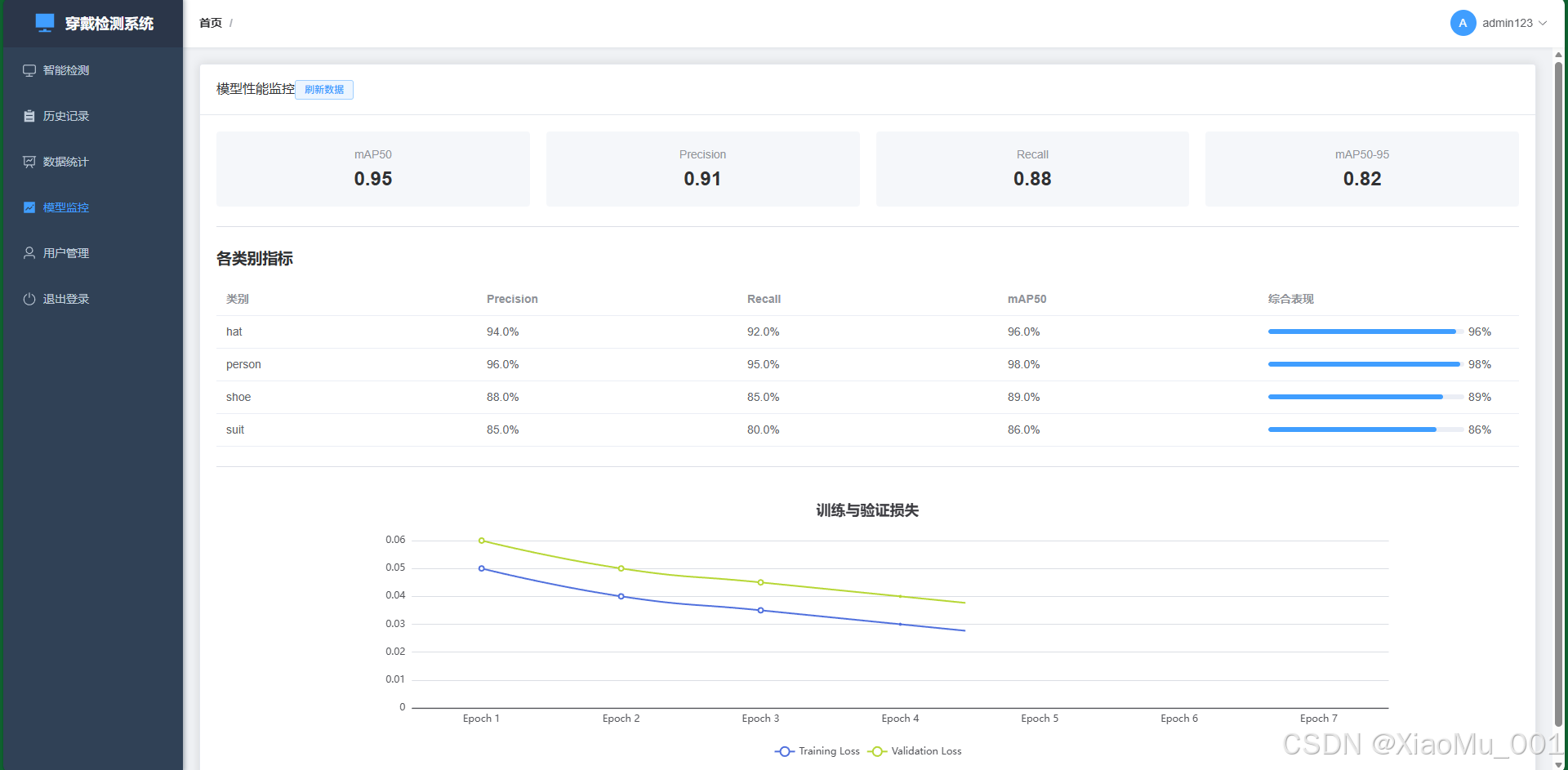- 展示内容: 实时读取后端配置的模型评估指标 (mAP, Precision, Recall) 以及训练过程中的 Loss 曲线。