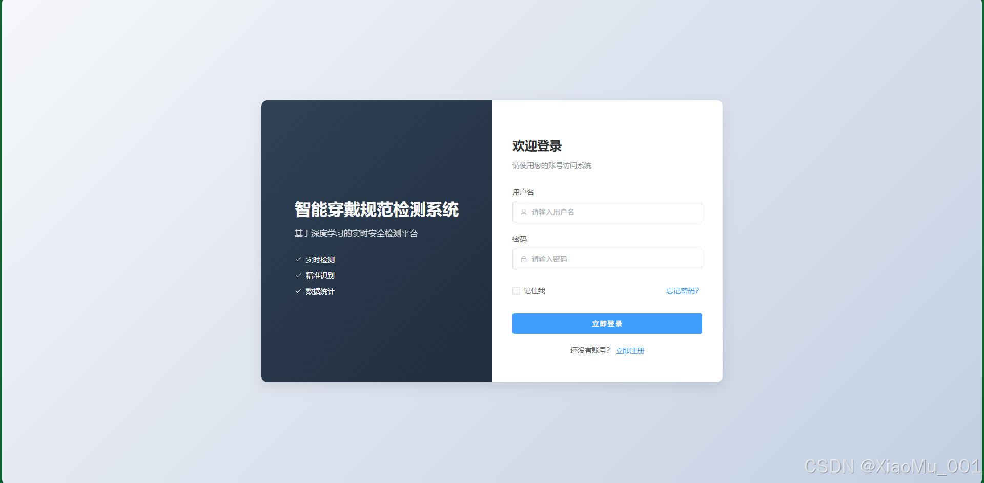 本系统是一个基于深度学习(YOLOv8)与 Web 技术(Django + Vue3)相结合的智能安全检测平台。本项目旨在解决工业现场及特定场所的安全规范管理问题,以帽子(安全帽/普通帽)与鞋子(安全鞋/普通鞋)的识别检测为例,展示了如何利用计算机视觉技术实时监测人员的穿戴合规情况。