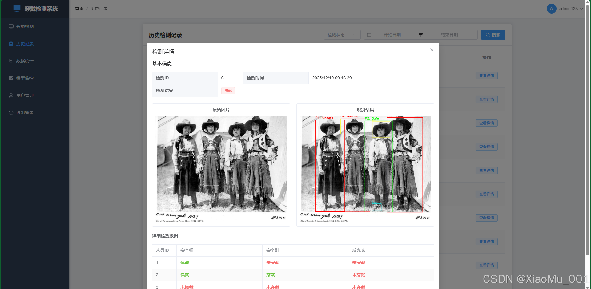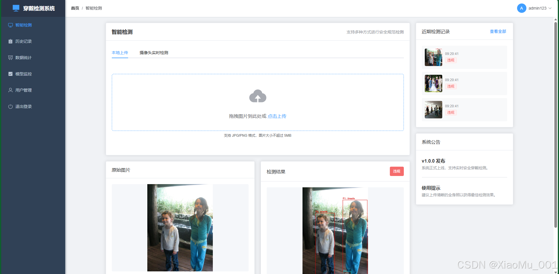 系统集成了图像采集、智能识别、逻辑判断(如是否佩戴安全帽、是否穿着合规鞋履)、违规报警、数据统计、历史记录查询以及用户管理等功能,形成了一个闭环的安全管理解决方案。