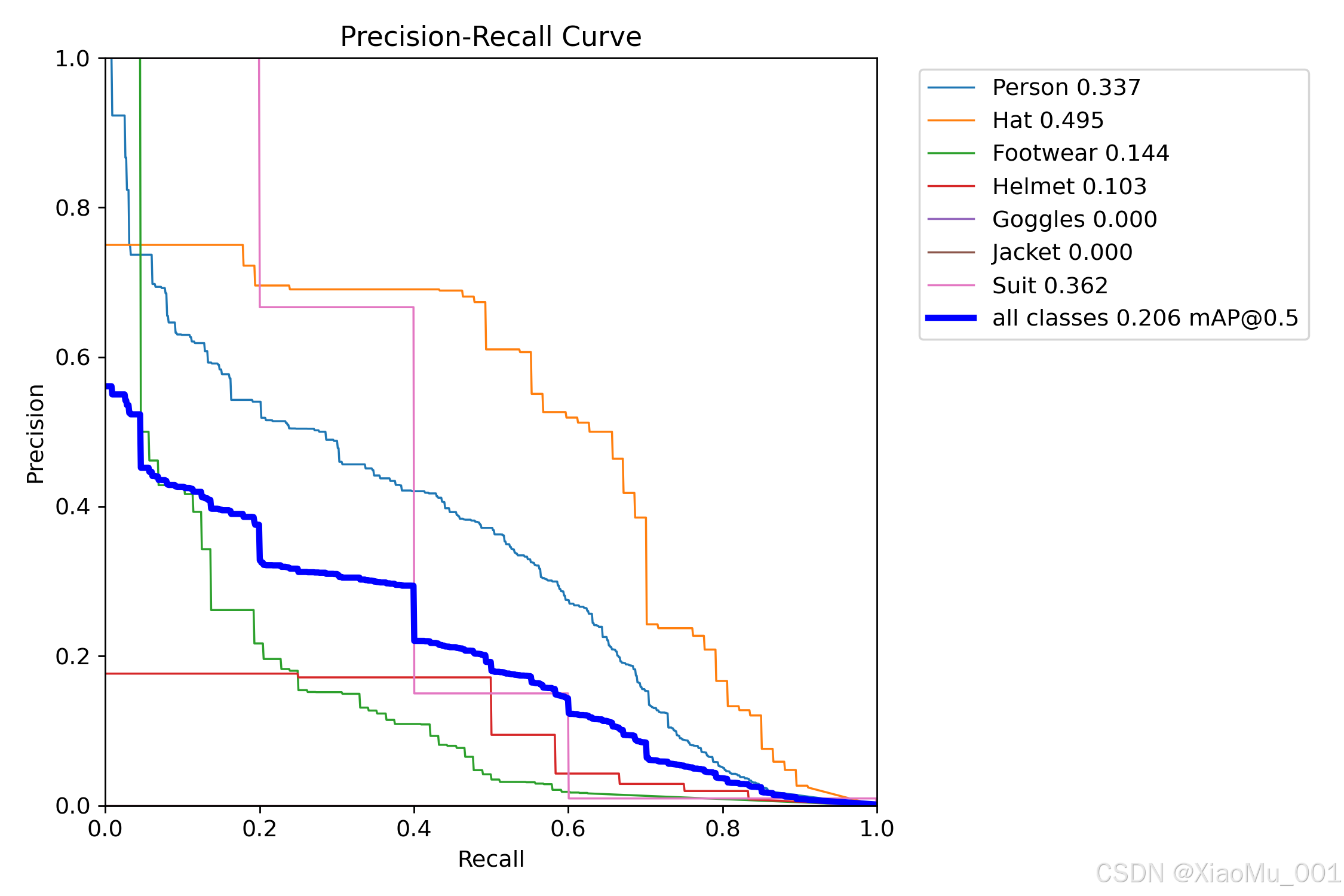 BoxPR_curve: Precision-Recall 曲线。该曲线下面积 (AUC) 即为 mAP (mean Average Precision)。曲线越靠近右上角,模型性能越好。可以看到模型在大部分类别上都取得了极高的 mAP (接近 0.99),说明检测非常准确。