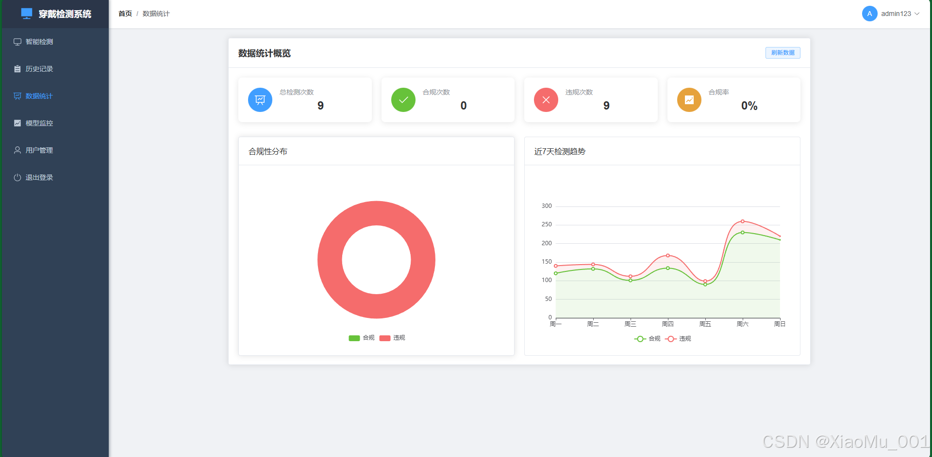 - 指标: 总检测次数、合规次数、违规次数、整体合规率。
