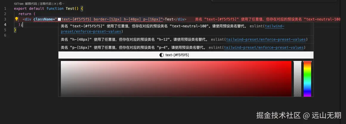 eslint-plugin-tailwindcss插件的no-unnecessary-arbitrary-value无法对所有的任意值进行校验,比如h-[48px]、text-[#f5f5f5]无法校验出来。但tailwindcss的预设值太多了,一个不小心可能就又写了一个没有必要的任意值。为了避免这种情况,我们需要自己实现一个检测任意值的eslint插件。
