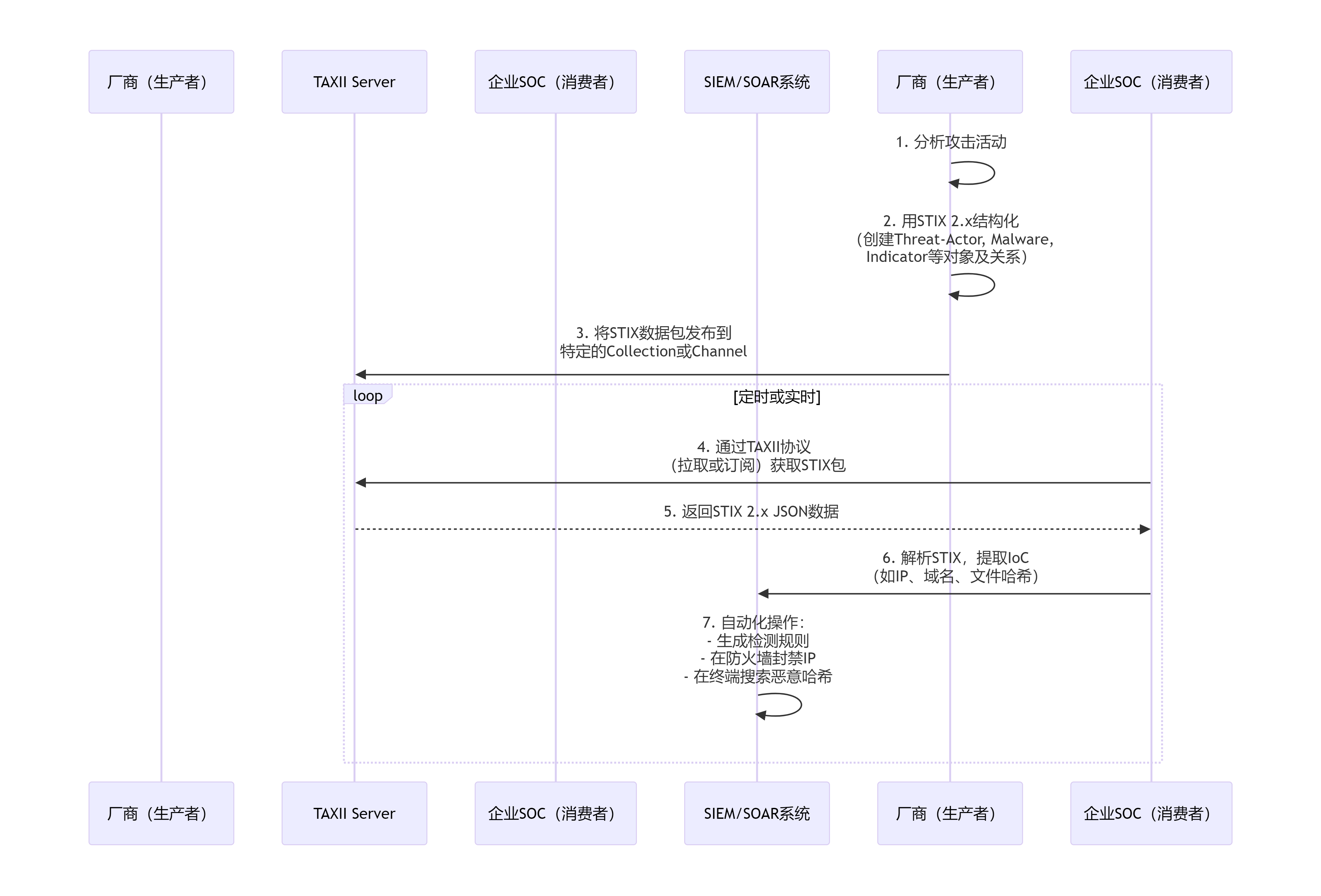 下图展示了一个从情报生产到消费的完整闭环,清晰地揭示了STIX和TAXII在其中扮演的角色与协同关系: