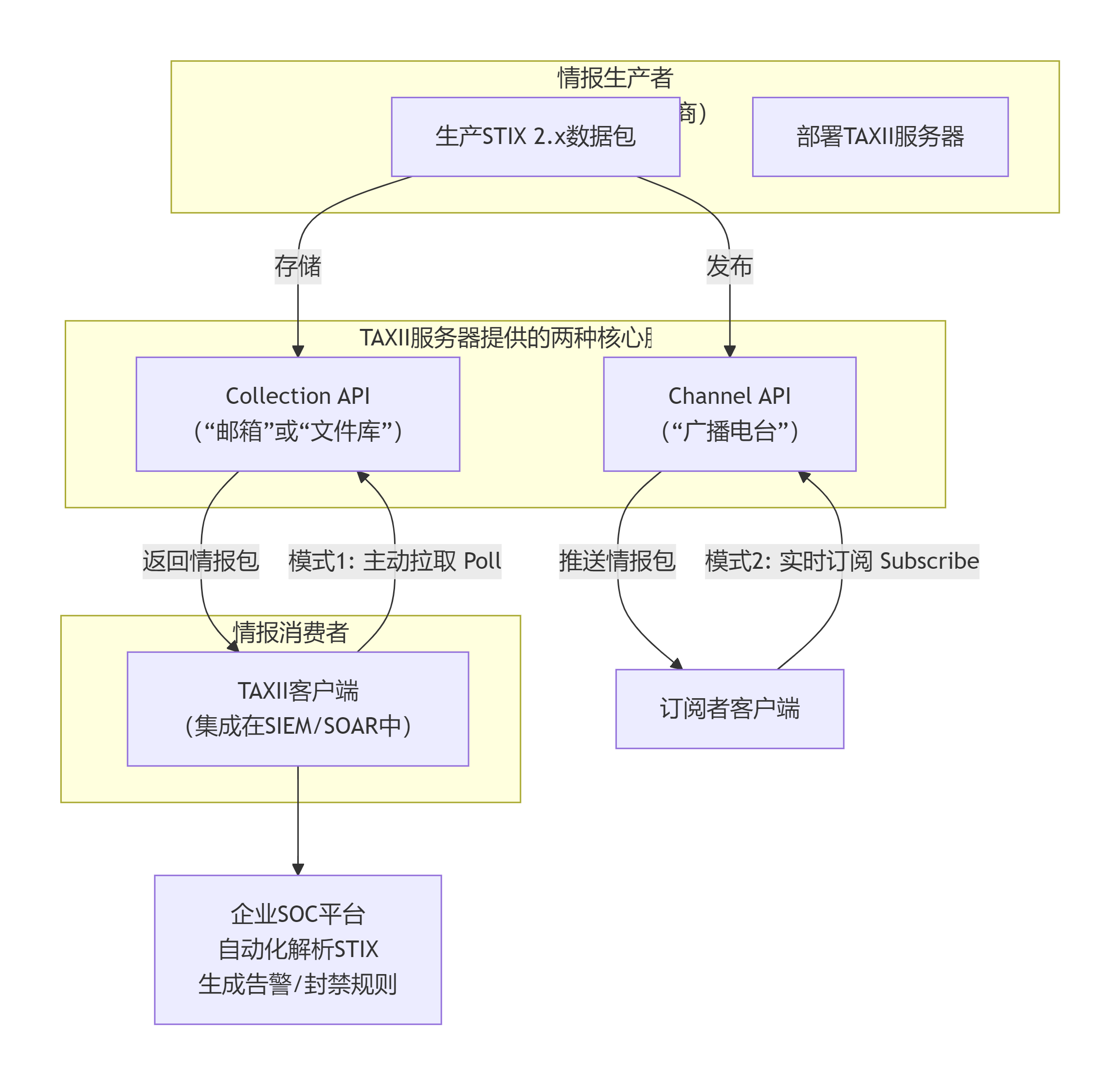 TAXII 是威胁情报的 "标准化传输协议与服务框架" (好比建立了一个在情报机构间安全传递这些"报告"的专用"邮局系统")。