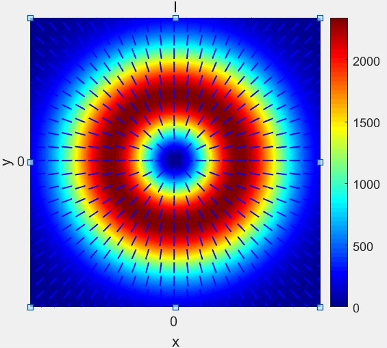 打开Matlab准备画个径向偏振光束玩玩。这玩意儿的特点是电场矢量沿半径方向分布,就像无数箭头从圆心向外发射。先别急着敲代码,咱得把极坐标系转成直角坐标------Matlab画图还是直角坐标系顺手。