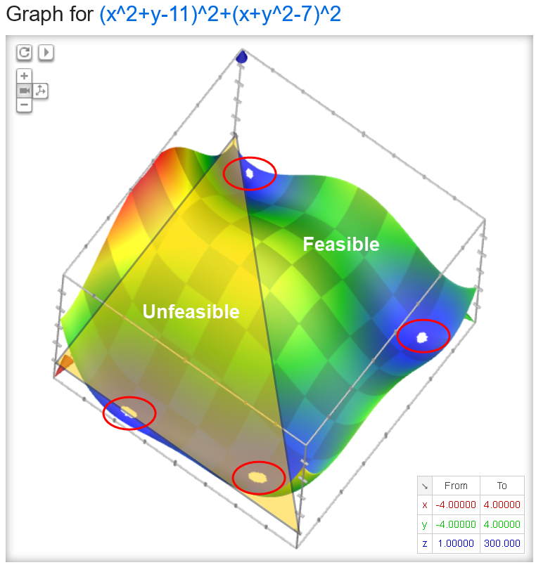如前所述,此示例输出存在四个最小值。当已知最优解需满足特定附加条件时,可添加约束。本例添加约束以获取 x\