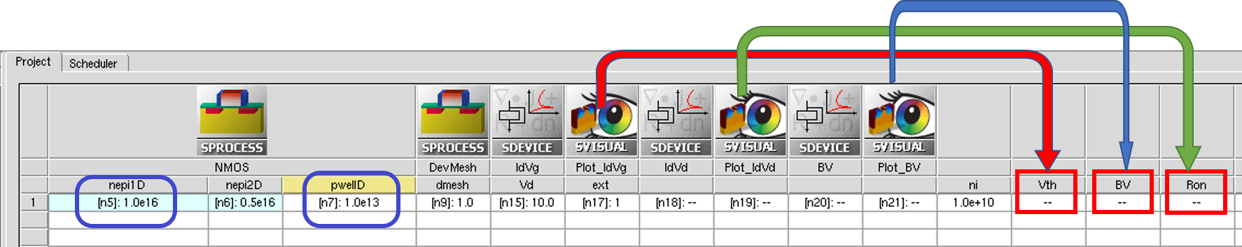 对于一个优化项目,需要更改的参数必须定义为 Sentaurus Workbench 参数(Sentaurus Workbench parameters),而用于计算目标值的输出必须定义为 Sentaurus Workbench 变量(Sentaurus Workbench variables)。